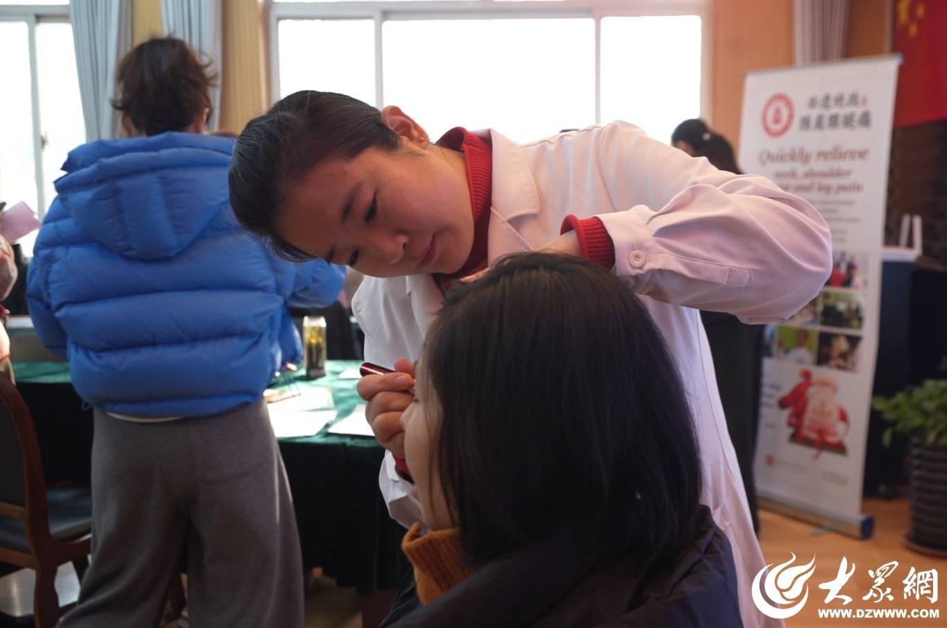 活动开始。教师们有序签到,每人领取一份健康检查单及清润乐膳食纤维粉。教师们持检查单依次接受专家问诊。山东省名中医药专家、原德州市中医院院长杨京慧耐心倾听教师们的健康诉求,从中医辨证角度提供常见病防治建议、用药指导和康复方案。现场还设有扶阳理疗体验区,由扶阳罐疗法传承人张新林为部分教师提供针对颈椎、腰椎、膝关节等部位的理疗服务;高级中医康复理疗师靳书敏则为教师们提供眼部抗衰、肌肉劳损调理等专项咨询与建议。