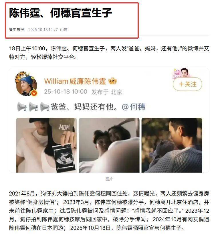 10月18日,陈伟霆和何穗同时官宣生子,这一消息瞬间在网上炸开了锅。