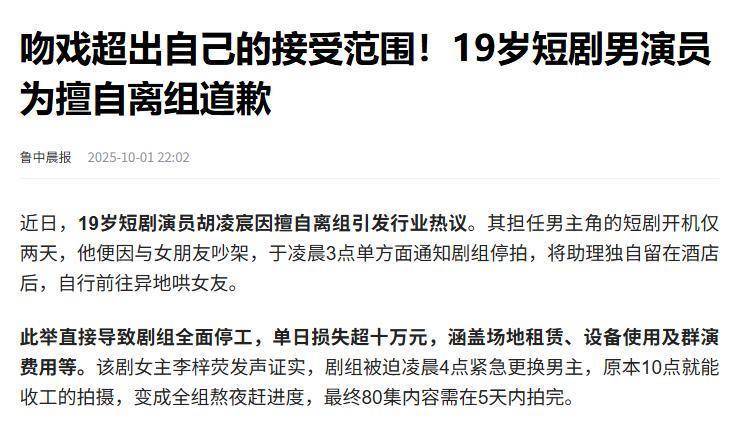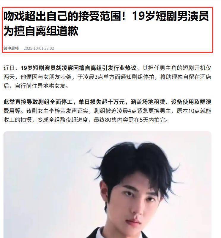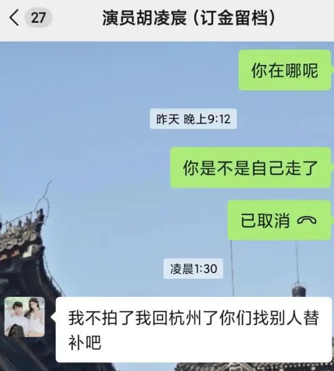 当时胡凌宸刚进组才2天,但某天凌晨,胡凌宸突然单方面通知剧组停拍。
