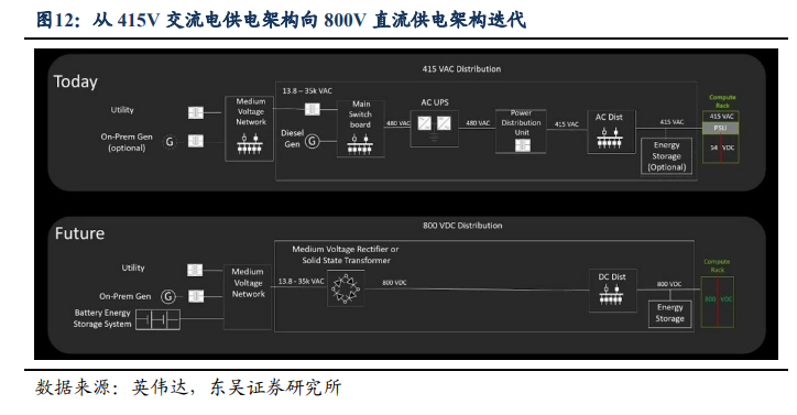 在此背景下,英伟达于2025年10月在OCP全球峰会上正式发布《800VHVDCArchitectureforNext-GenerationAIInfrastructure》白皮书,系统性提出以800V高压直流(HVDC)为核心的下一代AI工厂电源架构重构路径。其核心思路在于,通过在园区或机房侧完成集中AC/DC转换,将高压直流电直接分配至机柜甚至板级,显著减少传统供电路径中多级能量转换环节,从而降低系统损耗、缩减铜缆用量、提升功率密度,并更好适配GPU与各类加速卡功耗持续上行的趋势。白皮书明确指出,HVDC并非激进式替换,而是具备清晰的渐进落地路径:短期通过SidecarPowerRack等方案与现有UPS架构并存,中期逐步弱化甚至取消传统UPS,并与储能系统协同以平滑AI负载的强波动特性,长期则走向高压直流、模块化、高度系统集成的新型供电形态。整体来看,HVDC并非单点技术升级,而是一轮围绕AI算力密度跃迁展开的电源体系重构,其确定性与产业共识正在快速形成。