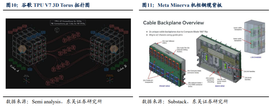 AI算力集群Scaleup&out迭代升级持续推进,短距高密度互联依赖铜缆筑牢基础,大规模高密度AI集群推升光模块需求,看好光铜双线共振。一方面,AI算力集群持续提升的芯片:光模块比例推动光模块需求持续提升。以英伟达RubinNVL144满配CPX为例,我们测算3层网络下其芯片:光模块比例可达到1:12,MetaDSF架构下,18432颗MTIA集群需18.432万颗800G光模块。另一方面,铜缆依旧是AI算力中心短距低延时互联的核心选择,谷歌TPUV7采用3DTorus拓扑,单机柜64颗芯片通过80根铜缆实现柜内互联,铜缆端口占比超六成,亚马逊Trainium3通过AEC铜缆完成背板及跨机架连接,整机柜需216根64端口PCIeAEC铜缆,支撑144颗芯片的Scaleup带宽需求。