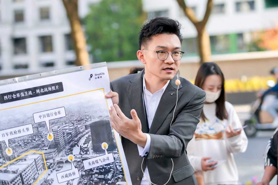 图说:朱一宁带领参与者体验“四行仓库—上海总商会”City Walk路线。